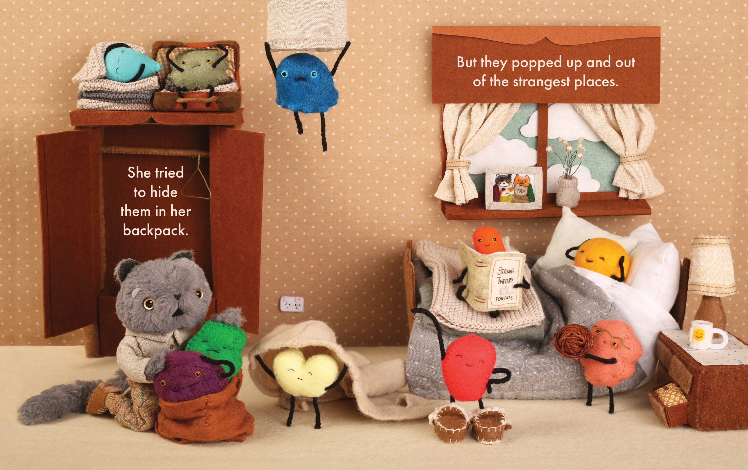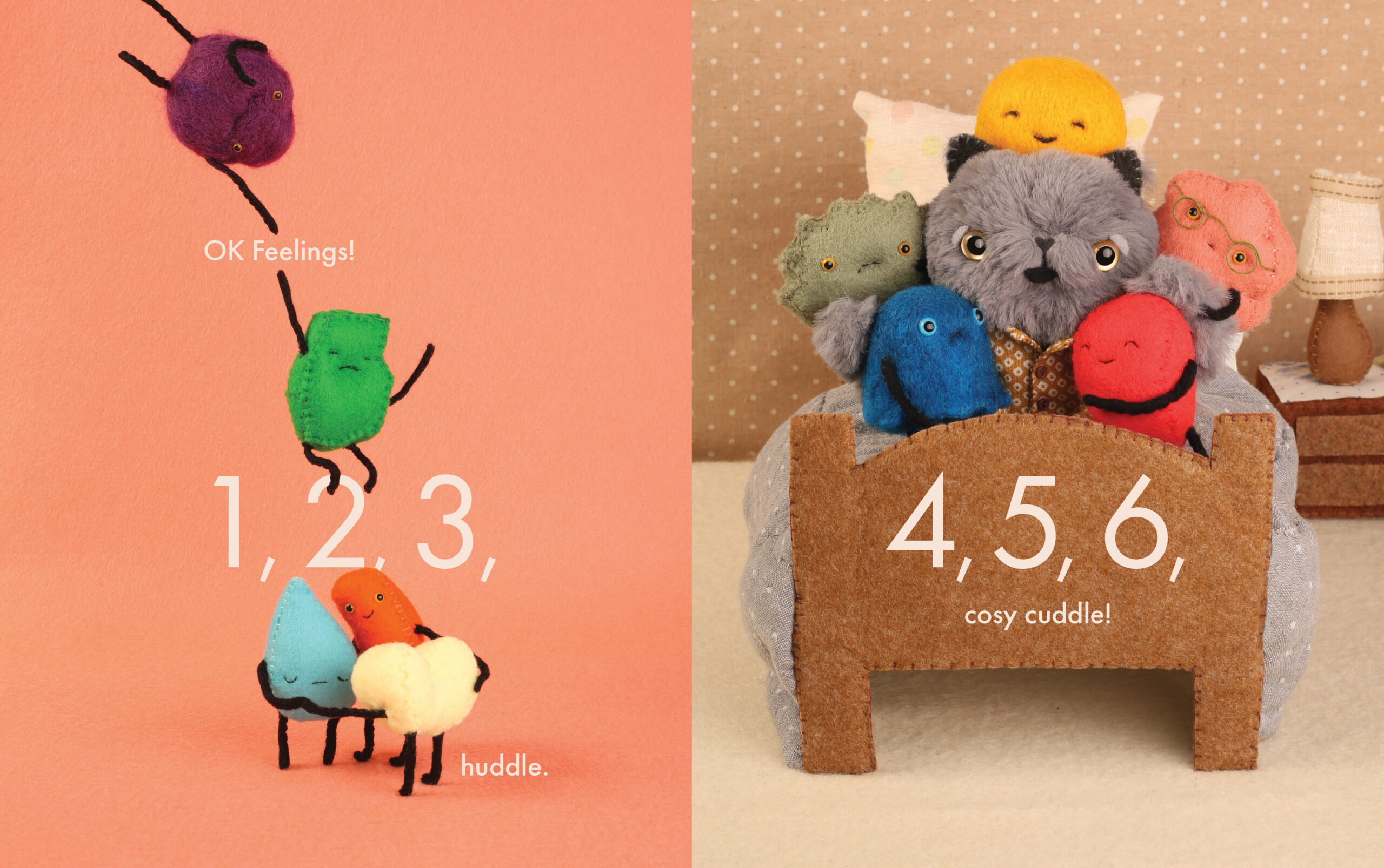 Art friends Michelle Mackintosh and Cat Rabbit create a magical world, where brightly coloured emotions romp through a soft and fuzzy landscape and end the day in a collective cuddle.